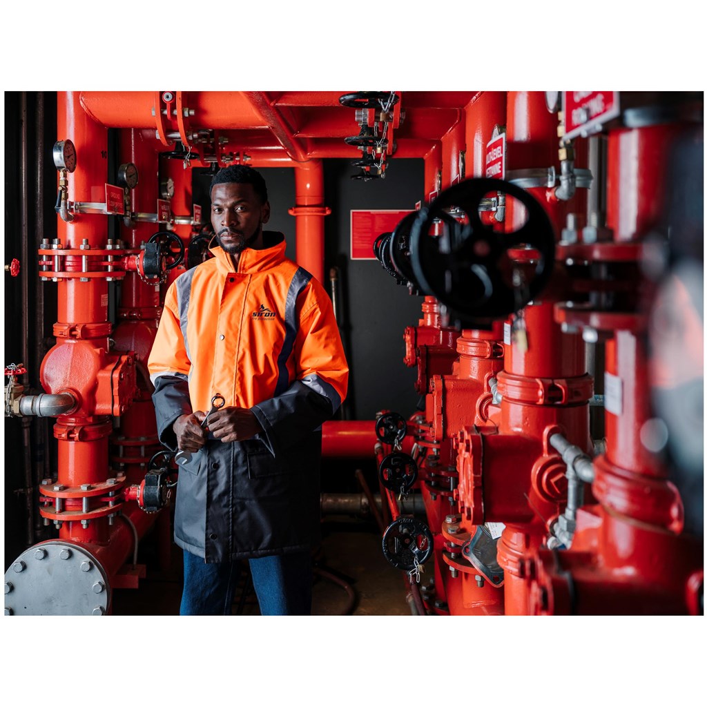 two-tone jacket with silver 50mm reflective tape detail • concealed zip features storm flap with press stud closure