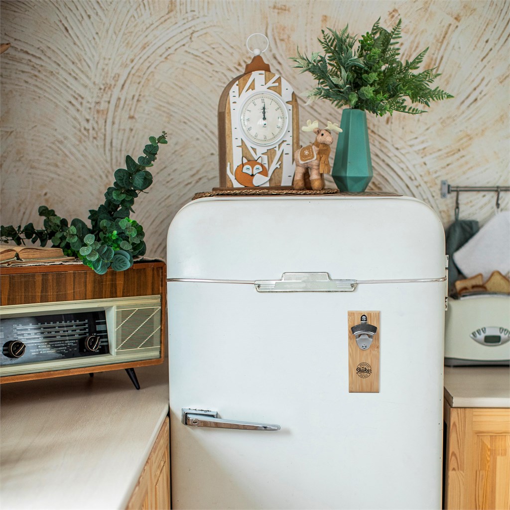 This handy bottle opener has strong magnets on the back of it, so it can be firmly mounted on a fridge. There’s also a magnet built into the natural bamboo board, to catch the bottle cap as it falls from the opener.